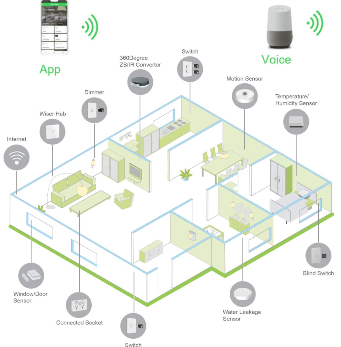 - Wiser is scalable: applications can begin with an in-room solution & build up across a home over time as needs or budgets evolve